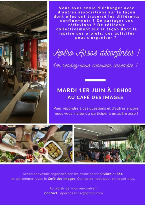 Pour répondre à ces questions et d’autres encore, nous vous invitons à participer à un Apéro-Asso le mardi 1er juin à partir de 18h à la Terrasse du Café des images.